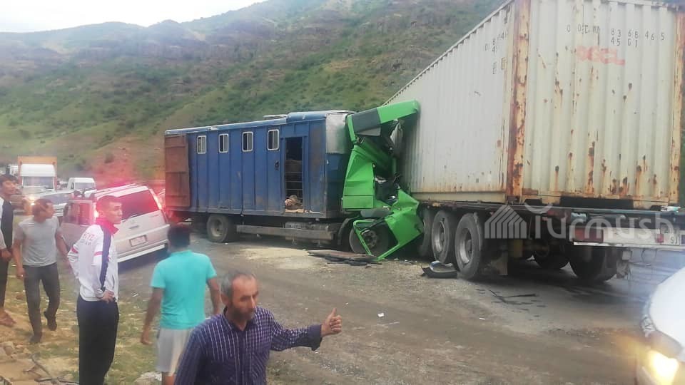 На автодороге Бишкек—Ош столкнулись два грузовика: Один погиб, еще четверо с различными травмами (видео)