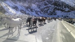 На перевале Тёо-Ашуу из-за выпавшего снега животноводы перегоняют стадо лошадей